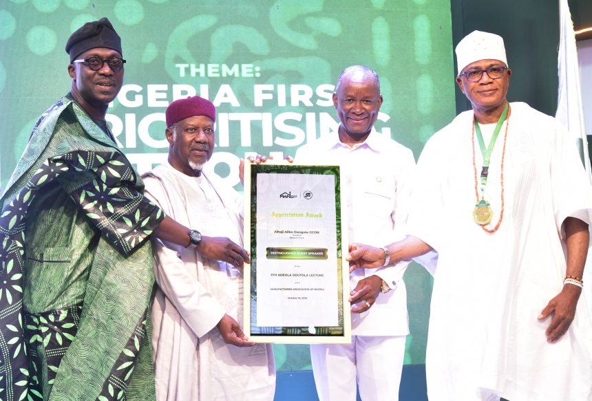 L-R: Director General, Manufacturers Association of Nigeria (MAN), Segun Ajayi-Kadir; Engr. Ahmed Mansur (Representative of Guest Speaker, Aliko Dangote, GCON, President/CE, Dangote Industries Limited, receiving an award); Honourable Minister of State for Industry, Trade and Investment, Sen. John Enoh (Rep. of President of Nigeria); President of Manufacturers Association of Nigeria (MAN), Otunba Francis Meshioye; at the 53 Annual Meeting of Manufacturers Association of Nigeria (MAN)/5th Adetola Odutola Lecture Presidential Luncheon in Lagos on Thursday, October 16, 2025.